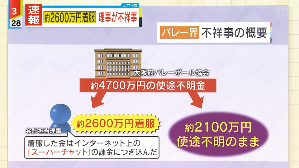 大阪府バレーボール協会(OVA、小比賀恵一会長)で、約4700万円の使途不明金があり、うち約2600万円を会計担当の理事が着服していたことが、6月27日までに関係者の話で分かった。バレー界では日本バレーボール協会(JVA)でビーチバレーの国際大会のキャンセル手続きを巡る診断書偽造を把握しながら隠ぺいしていたとして、当時の嶋岡健治会長が引責辞任。また、関係者によると全国連盟と他の県協会でも不明朗な会計処理などが発覚したという。